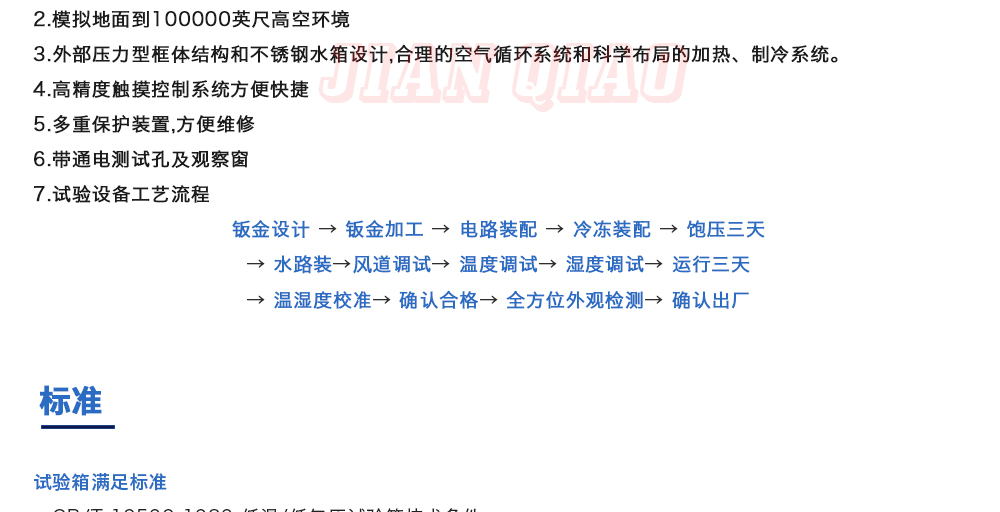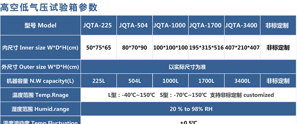 產(chǎn)品型號:JQTA-225 品牌:劍 喬 用途:高空低氣壓試驗箱主要用于試驗工件在低氣壓、高溫低溫、凝露、結霜單項或同時作用下的環(huán)境適應性與可靠性試驗,并或同時對試件通電進行電氣性能參數(shù)的測量。高空低氣壓試驗箱咨詢熱線:13829135130