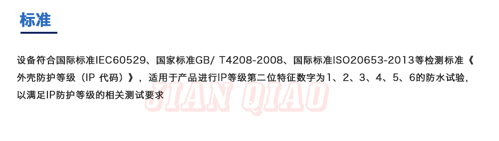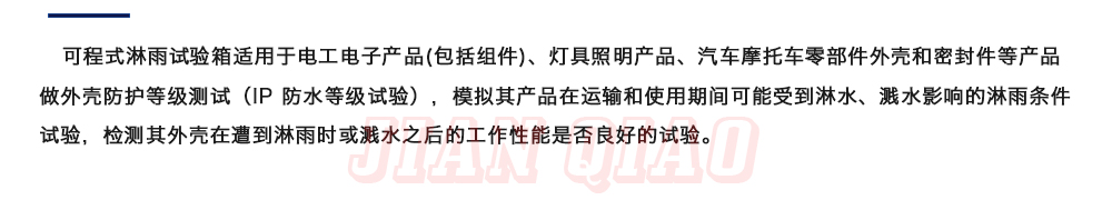 產(chǎn)品型號:IPX-1234 品牌:劍 喬 用途:可程式淋雨試驗箱適用于電工電子產(chǎn)品(包括組件)、燈具照明產(chǎn)品、汽車摩托車零部件外殼和密封件等產(chǎn)品做外殼防護(hù)等級測試(IP 防水等級試驗),模擬其產(chǎn)品在運輸和使用期間可能受咨詢熱線:13829135130