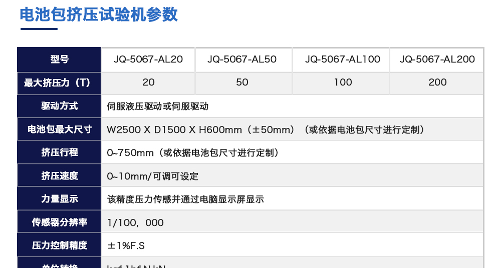 產(chǎn)品型號:JQ-5067-AL20 品牌:劍 喬 用途:電池包擠壓試驗機模擬各類動力動力電池包和系統(tǒng)在運輸、儲存及使用過程中電池包遭受碰撞擠壓的情形,人工呈現(xiàn)電池在遭受擠壓時可能出現(xiàn)的不同狀況。咨詢熱線:13829135130